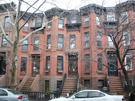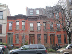 Below is another example of the common brick-with-brownstone-trim neo-Grec style in Park Slope. These are from 7th Street between 6th & 7th Avenues. Like the houses above, the ones below exhibit a distinctive fan-shaped detail at the upper corners of the windows: